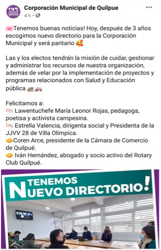 Aprovechamos la oportunidad para desearle a la Alcaldesa Srta. Valeria Melipillan y Directorio . Éxito en su gestión