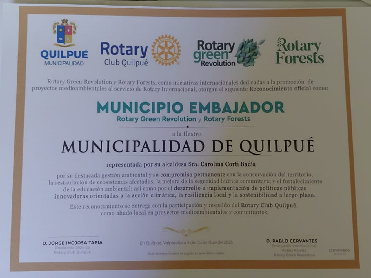 El día viernes 5 de diciembre, llegó de España el socio Pablo Cervantes Andrade siendo portador de reconocimientos para la Municipalidad de Quilpué y para nuestro club sobre el trabajo conjunto de ambas instituciones en la preservación del medio ambiente.